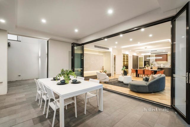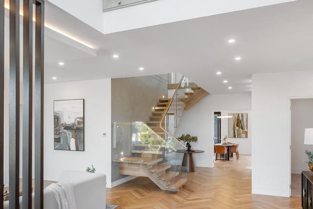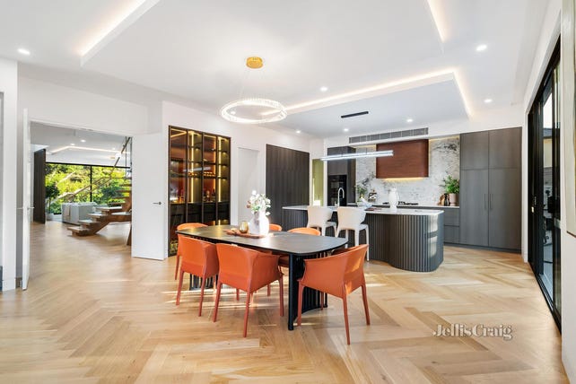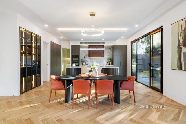 Architecturally designed to the highest calibre, a towering chandelier entry void and premium Beach Oak herringbone flooring welcome sophisticated spaces, with a formal lounge (electric fireplace) preceding a vast open-plan living/dining area, with a seamless connection outdoors to a private entertaining alfresco. The bespoke kitchen is appointed for the inspiring home chef, lavishly appointed with Miele appliances, stone surfaces, integrated fridge/freezer and Butler’s kitchen with Fotile appliances.