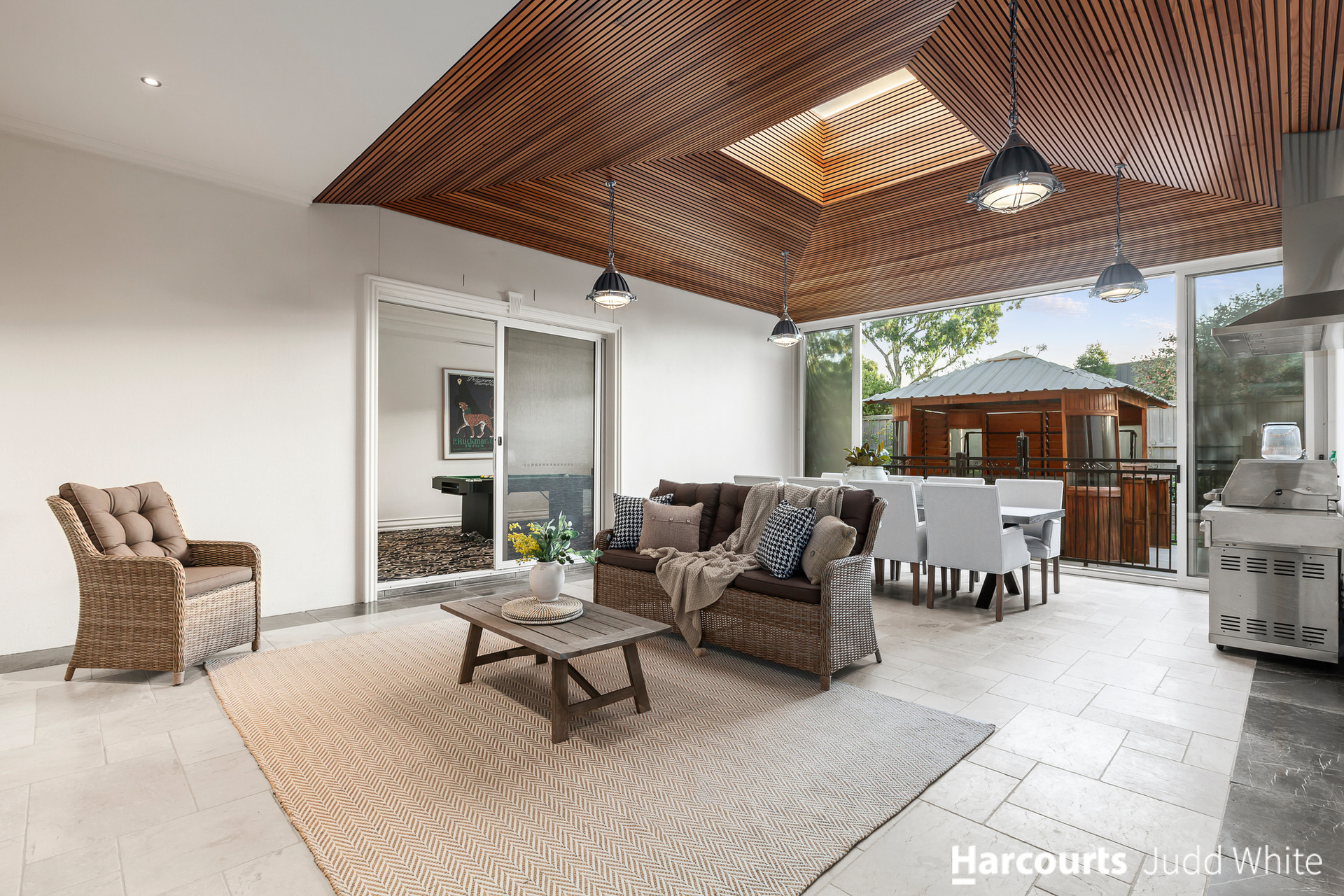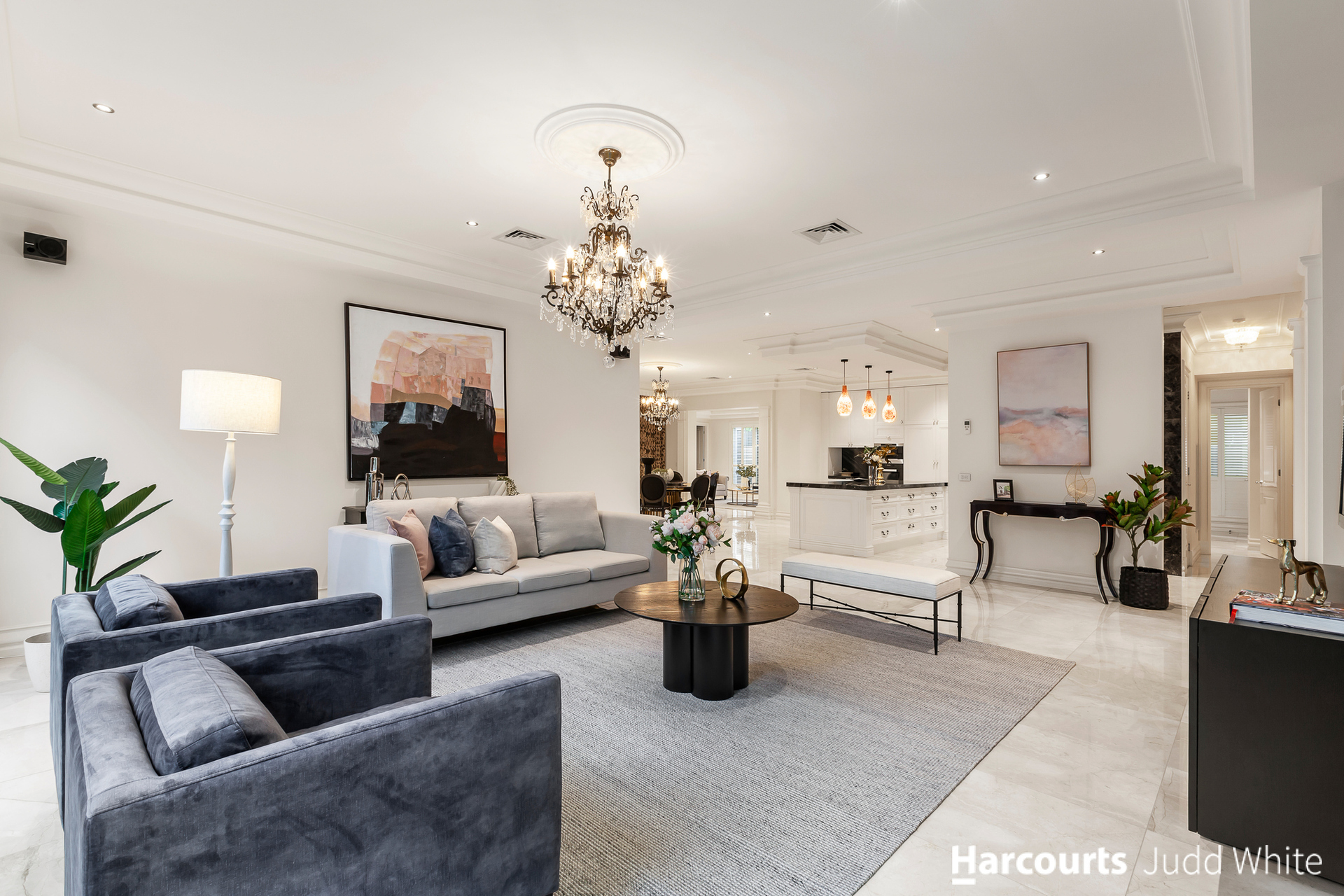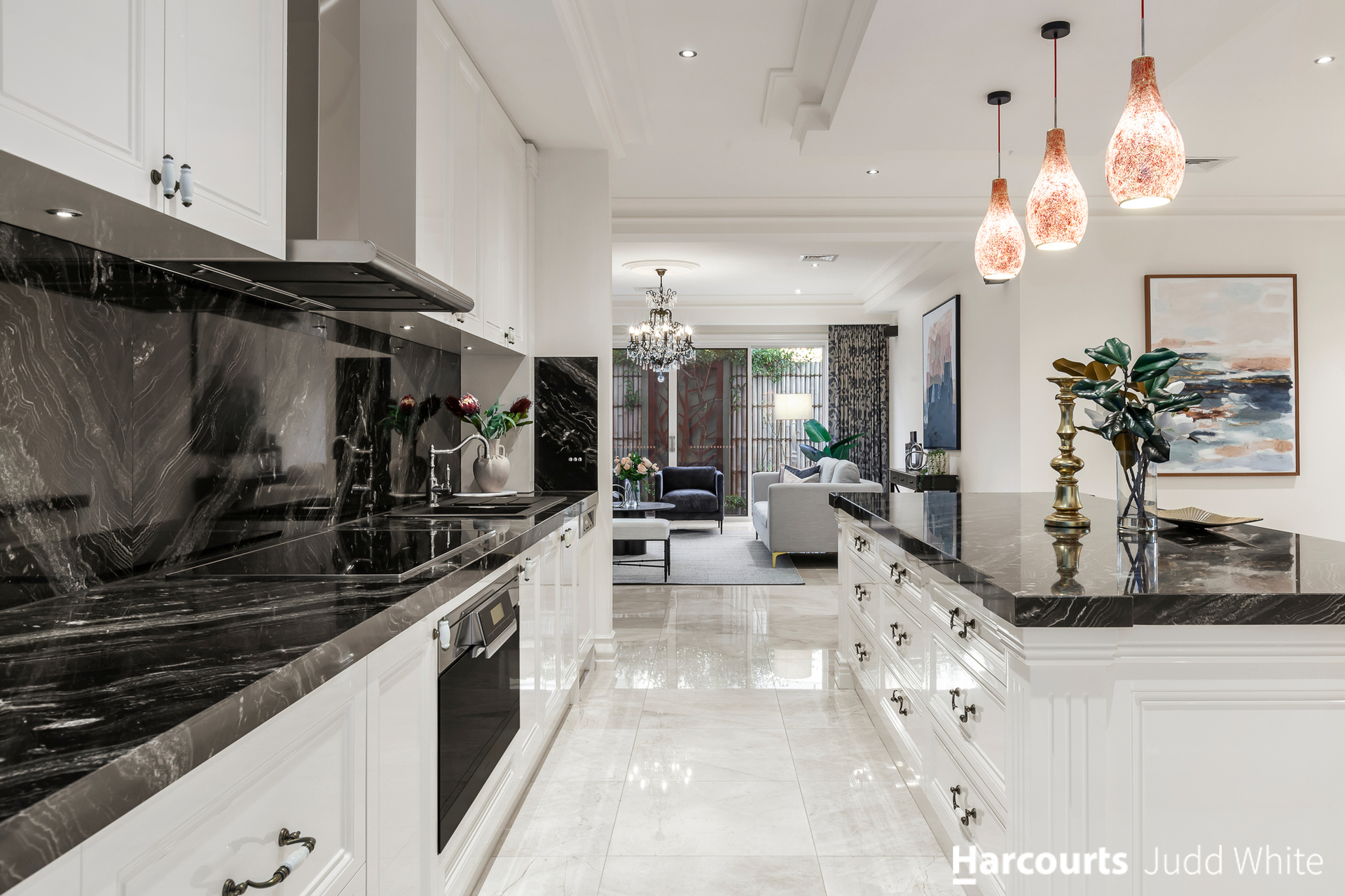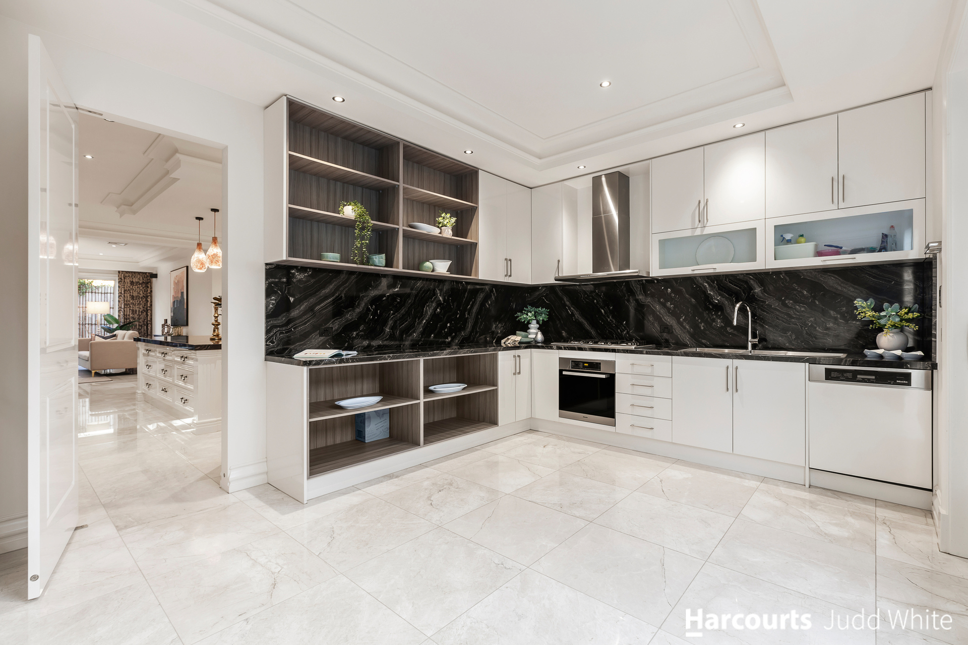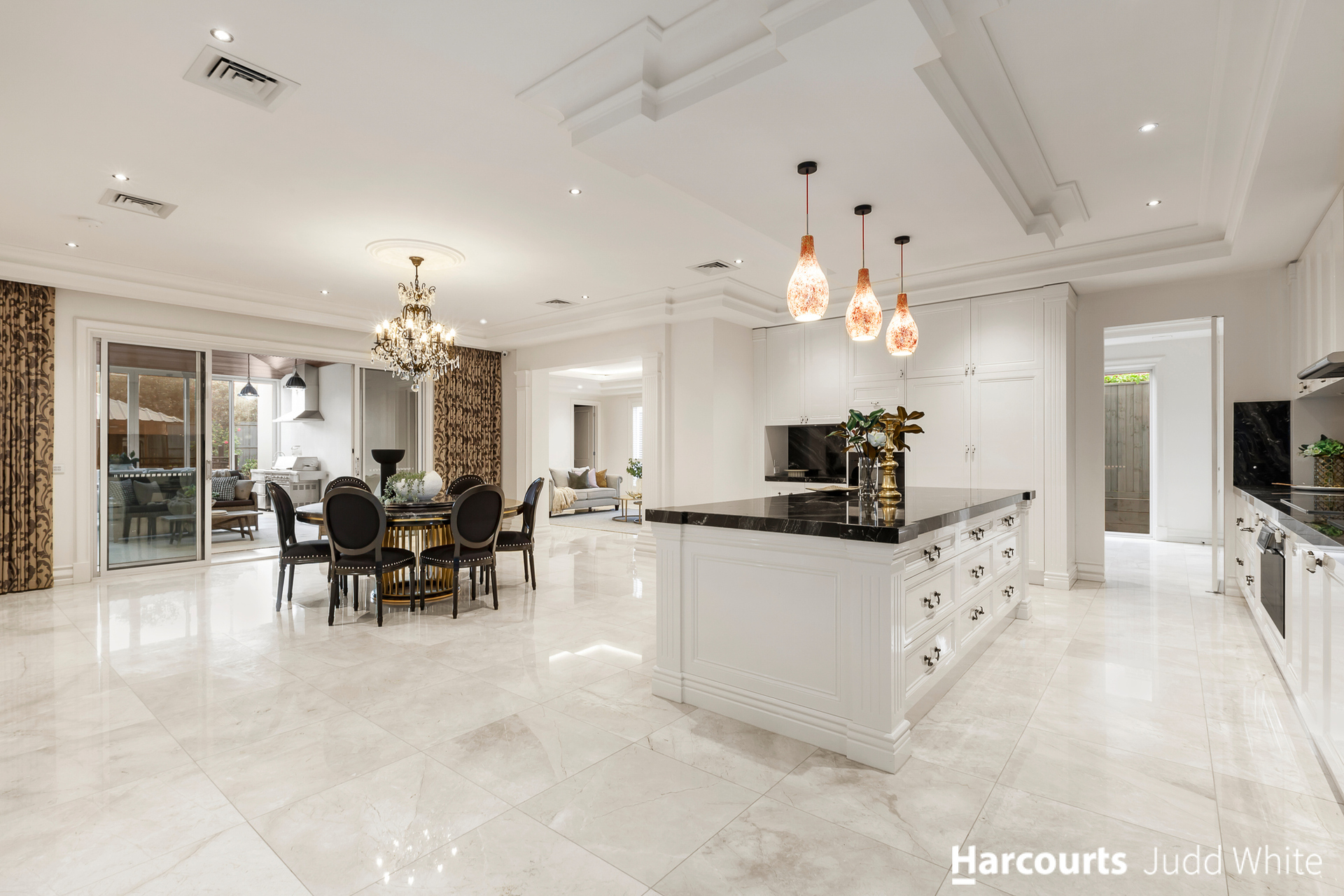 Displaying peerless presentation and attention to detail, the family room and dining zone connect to the kitchen flaunting stone benches, Miele appliances, integrated fridge/freezer plus a huge 2nd kitchen.