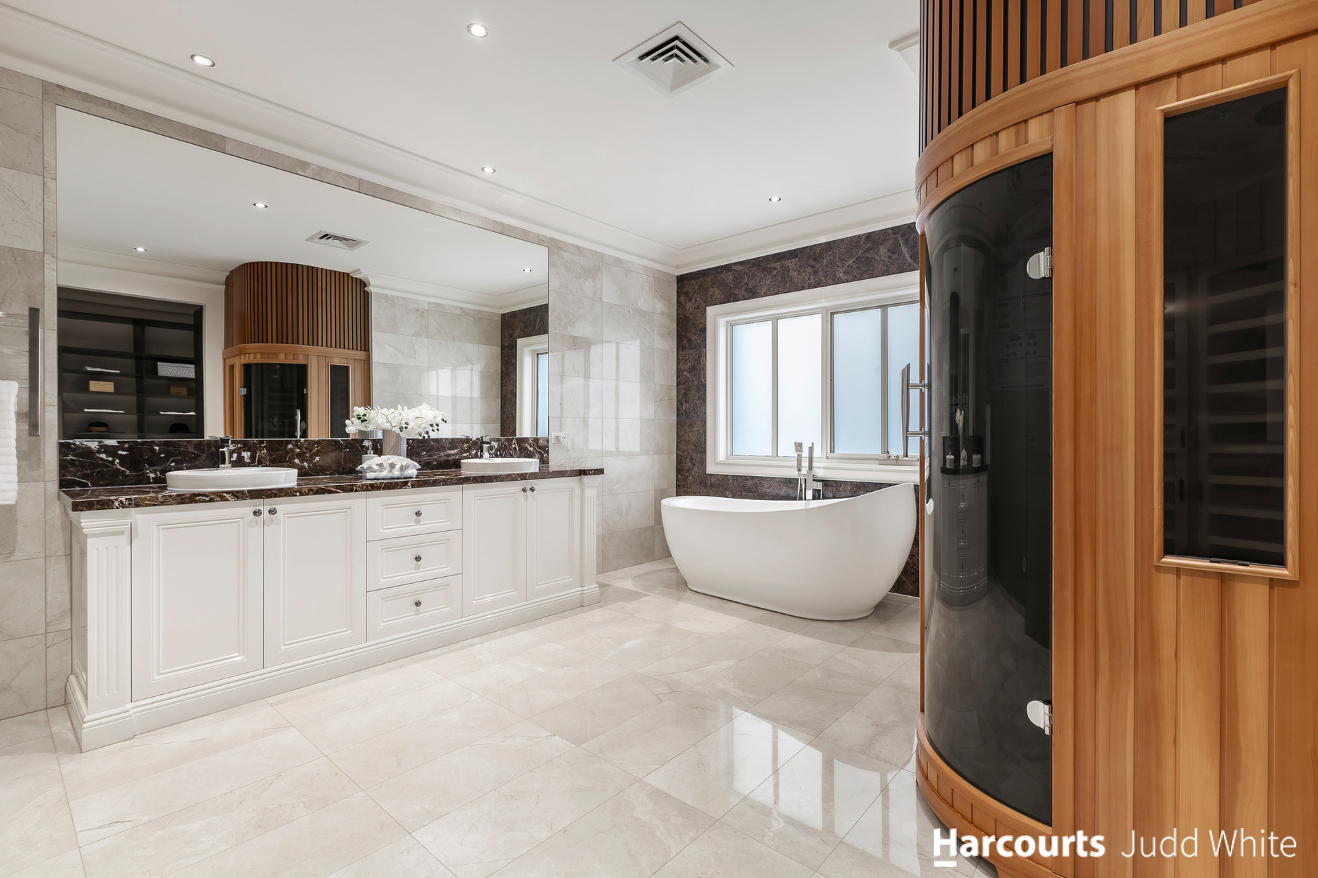 Five robed and ensuited bedrooms complete the home's lavish dimensions and incorporate an opulent master suite with walk-in-robe and dual vanity ensuite with sauna, further complemented by a powder room and laundry.