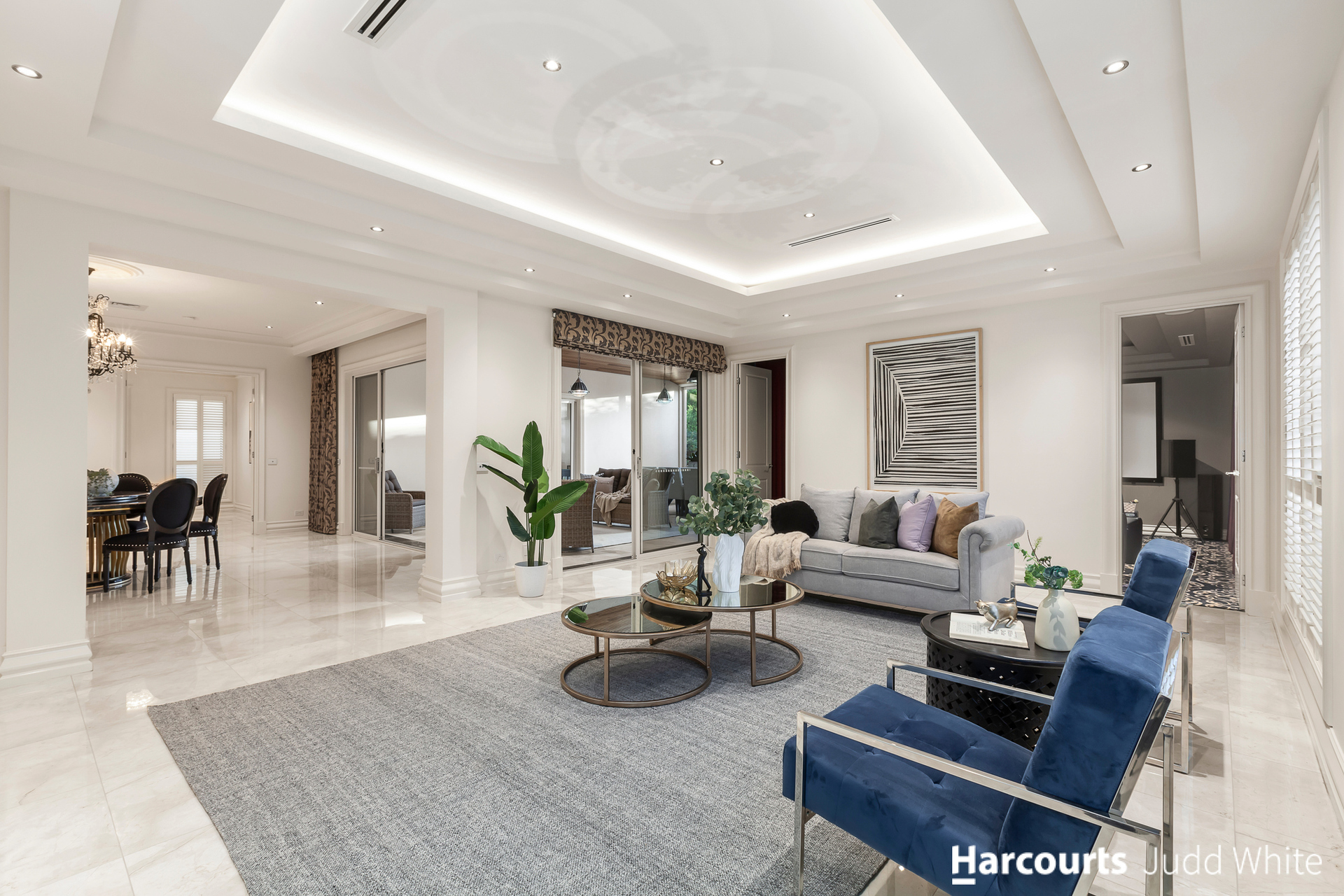 Passing through the grand double doors, you are greeted by an opulent formal lounge room adorned with shimmering marble tiles featuring floor heating, complemented by a cozy gas log fire. Adjacent to this is a spacious home office with ample storage space.